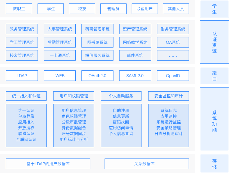 用戶類型管理,人員信息同步,賬號(hào)全生命周期管理,角色管理,權(quán)限管理,組織管理,賬號(hào)和密碼安全策略。