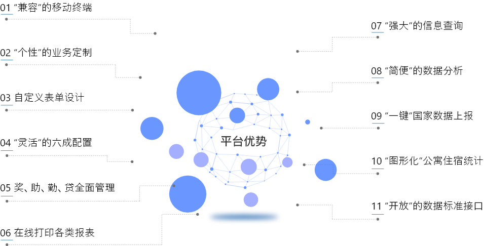 以學(xué)生、班干部、班主任(輔導(dǎo)員)、學(xué)院、學(xué)生處、學(xué)校領(lǐng)導(dǎo)等不同視角對(duì)用戶(hù)關(guān)注的信息與服務(wù)進(jìn)行有效組織。 學(xué)生用戶(hù):資、助、勤、貸等服務(wù)的申請(qǐng);班主任、輔導(dǎo)員:日常事務(wù)的待辦審批,工作周報(bào),學(xué)生干部管理,班級(jí)學(xué)生成績(jī)變化等; 領(lǐng)導(dǎo)層面:學(xué)生數(shù)據(jù)分析(如學(xué)生信息、獎(jiǎng)懲、困難、 生源、就業(yè)率等方面)。