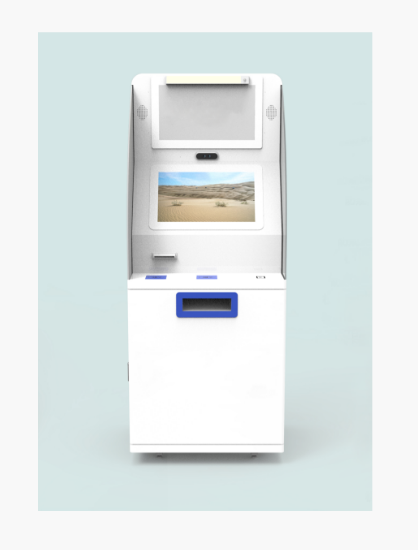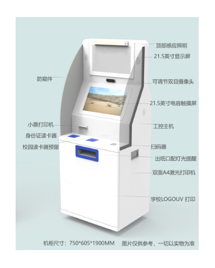 雙屏顯示(操作屏+廣告屏),內(nèi)置三紙盒彩色激光打印機(jī),標(biāo)配雙目攝像頭,掃碼器(一維、二維)、身份證讀卡器,預(yù)留一卡通安裝空位,具有紅外人體接近感應(yīng),頂部照明,讀卡位、出紙口配備燈光提醒等。